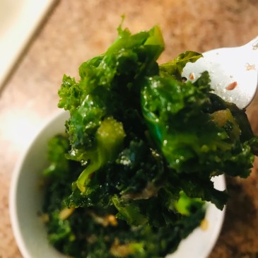 Add Kale and toss it with tongs or a large spoon making sure it’s nice and coated. If it’s not completed coated drizzle a little olive oil and cover pan for 5 minutes or so. Again, you may have to adjust the time if you’re making a larger batch. Cook until the liquid has evaporated. If it’s not as tender as you’d like add a tiny drizzle of Olive Oil, cover and cook it a little longer. Remember if you don’t like the “crunch” when you bite into your veggies add a couple tablespoons of vegetable broth. In fact…you can start with adding a little vegetable broth with the olive oil and let it cook covered for 5 minutes. However, if you add broth be sure to use less seasoning because the broth adds flavor and you don’t want to over power the Kale with too much seasoning. Remove from burner, let it stand for a couple of minutes and serve as a side dish or for Meatless Mondays!